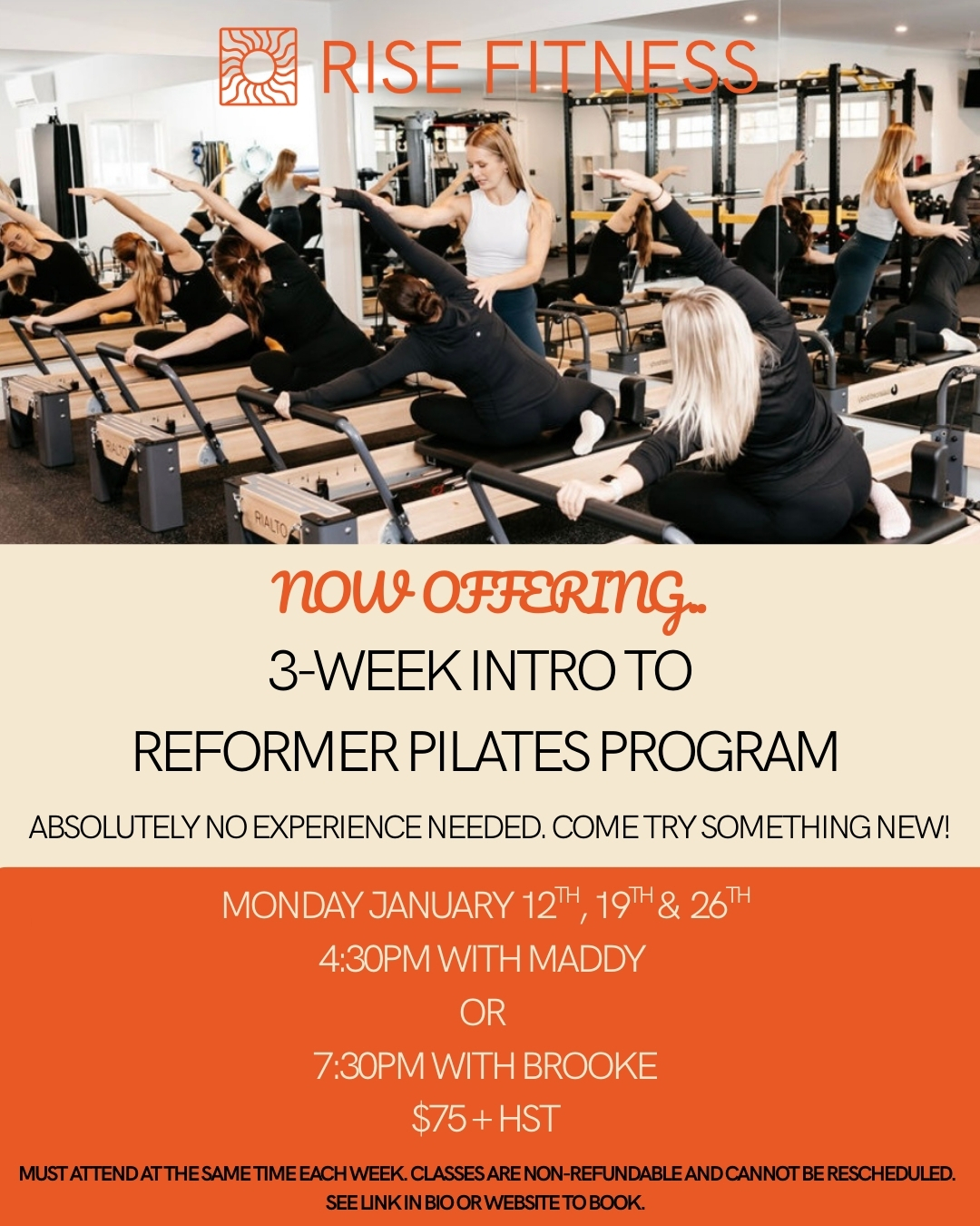 Rise Fitness is pleased to offer reformer pilates! Join us in one of the fastest growing areas of the fitness world. Reformer pilates is more than just a trend, it is an incredible way to build strength, stability, and your mind-muscle connection. Our drop-in classes are “open level”, meaning they are appropriate for a wide range of fitness levels with progressions and regressions offered to allow for a fun and challenging experience for all.